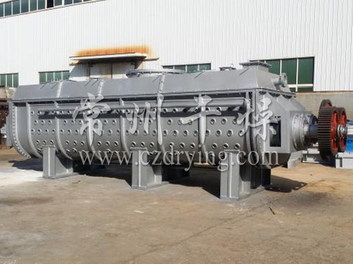 空心軸上密集排列著楔型中空漿葉,熱介質(zhì)經(jīng)空心軸流經(jīng)漿葉。單位有效容積內(nèi)傳熱面積很大,熱介質(zhì)溫度從-40℃到320℃,可以是水蒸汽,也可以是液體型:如熱水、導熱油等。間接傳導加熱,沒有攜帶空氣帶走熱量,熱量均用來加熱物料。熱量損失僅為通過器體保溫層向環(huán)境的散熱。楔型漿葉傳熱面具有自清潔功能。物料顆粒與楔型面的相對運動產(chǎn)生洗刷作用,能夠洗刷掉楔型面上附著物料,使運轉(zhuǎn)中一直保持著清潔的傳熱面。漿葉干燥機的殼體為Ω型,殼體內(nèi)一般安排二到四根空心攪拌軸。殼體有密封端蓋與上蓋,防止物料粉塵外泄而充分發(fā)揮作用。